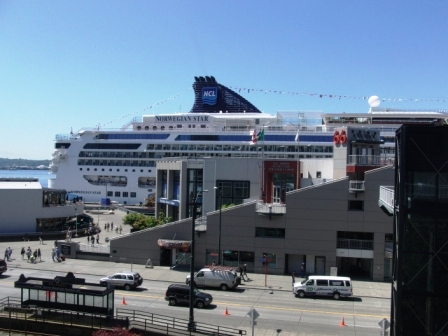 | Our first glimpse of the cruise ship taken from the parking garage. |